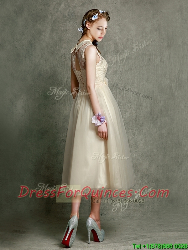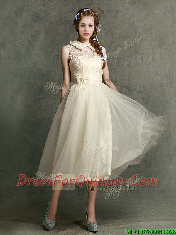Pretty High Neck Champagne Dama Dresses with Lace and Hand Made Flowers