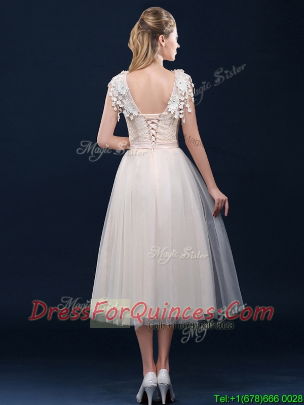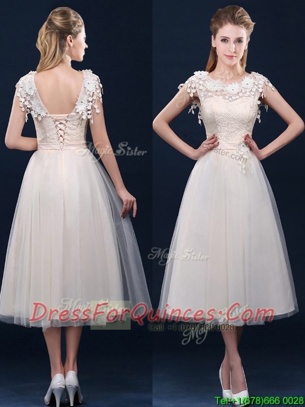 Pretty Tea Length A Line Dama Dresses with Cap Sleeves