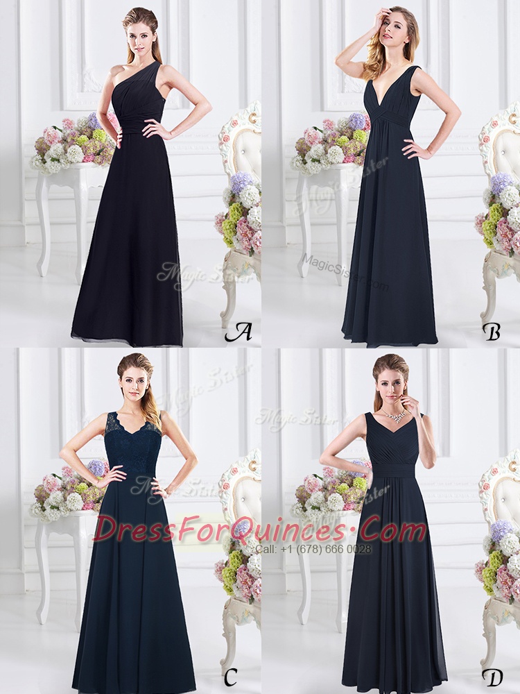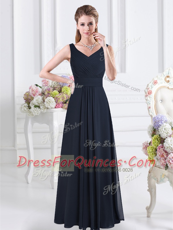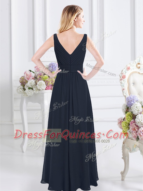 Ruching Quinceanera Dama Dress Navy Blue Zipper Sleeveless Floor Length