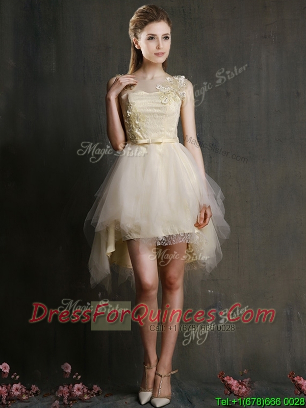 See Through Scoop Champagne Dama Dresses with Appliques and Belt