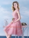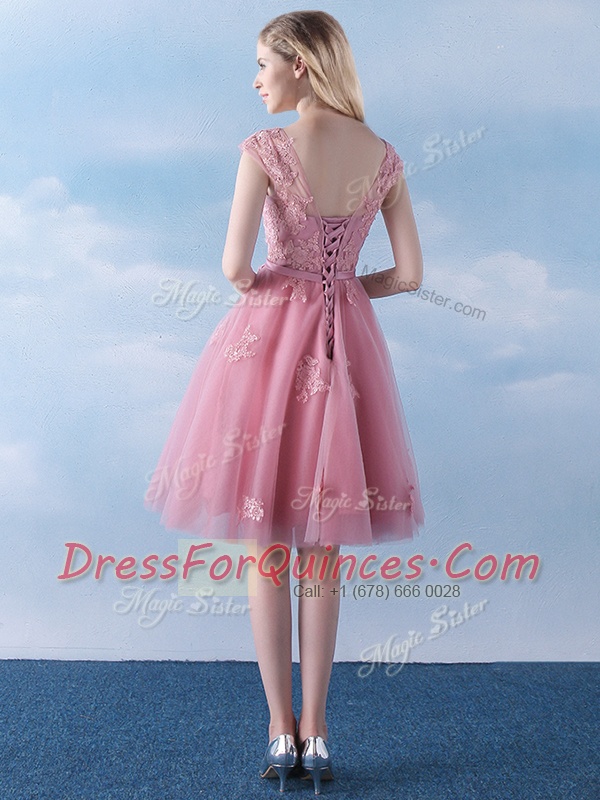 Superior Pink Lace Up Scoop Appliques and Belt Quinceanera Court of Honor Dress Tulle Cap Sleeves