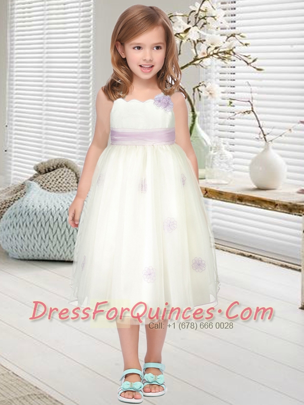 2014 A-Line Straps Sweet Belt Flower Girl Dress with Tea-length
