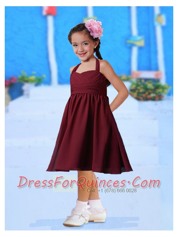 2014 Decent Burgundy Empire Chiffon Ruching Flower Girl Dress with Halter