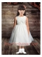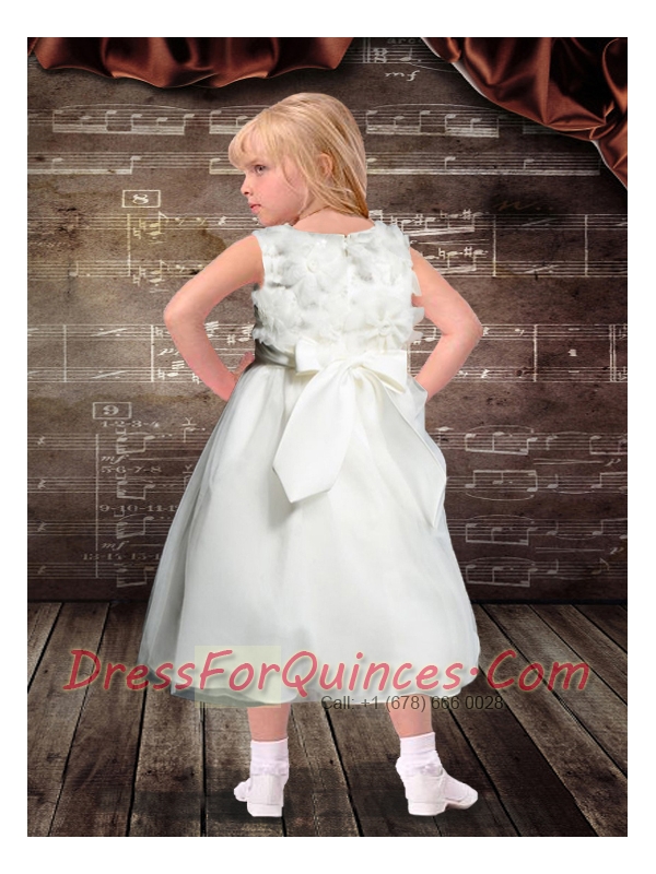 2014 Popular White Tea-length Scoop Flower Girl Dress with Hand Made Flowers