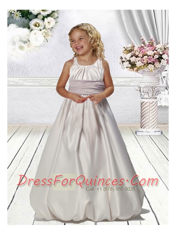 A-Line Straps Flower Girl Dress with Belt Ruching in White for 2014