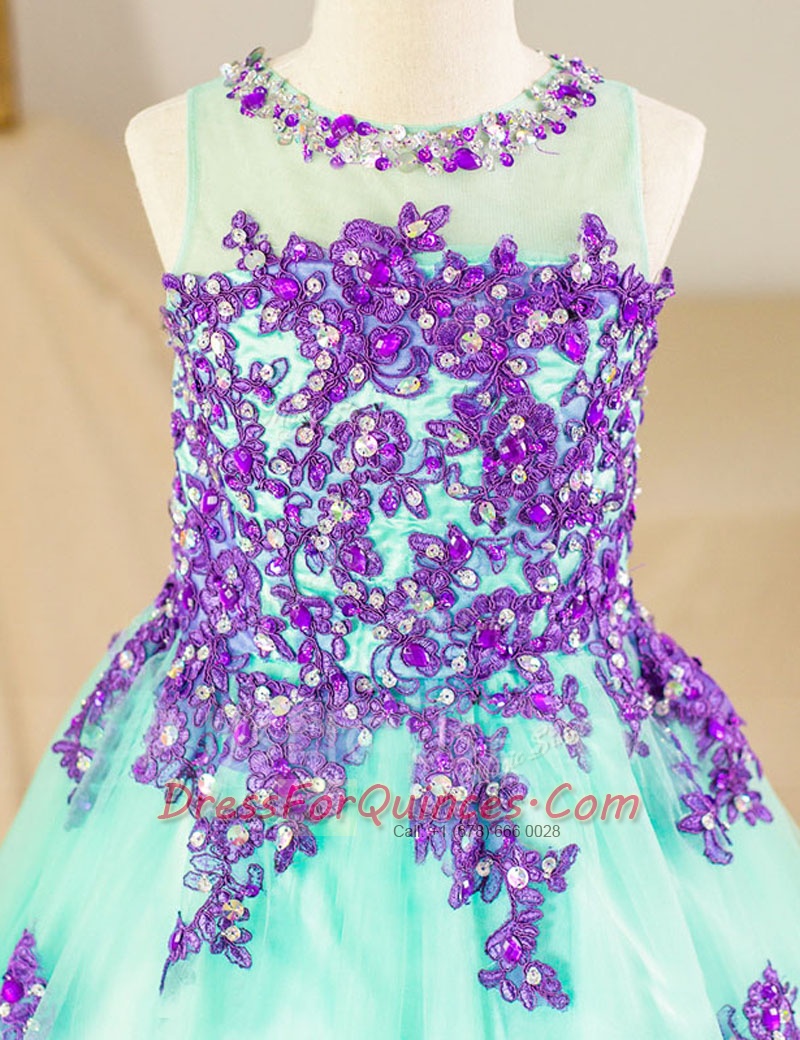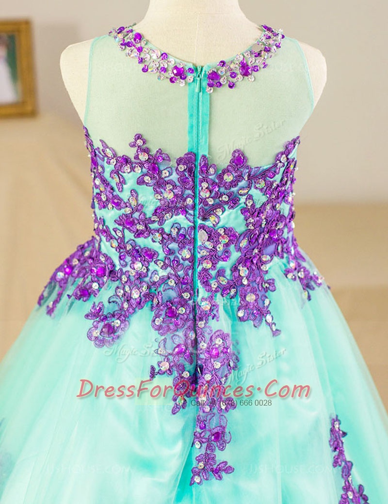 Designer Scoop Floor Length Turquoise Flower Girl Dresses for Less Tulle Sleeveless Beading and Lace and Appliques