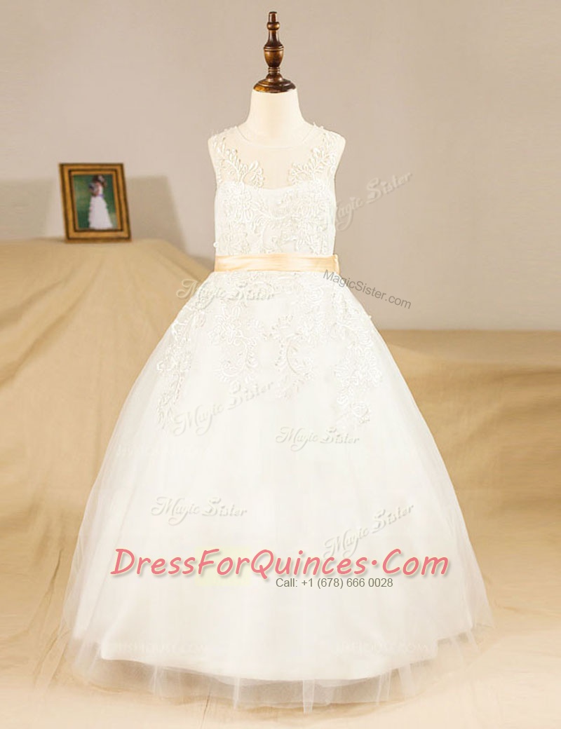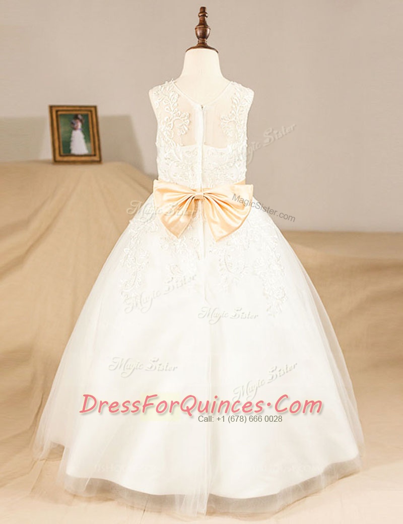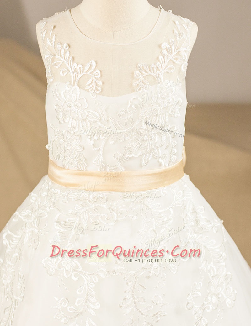 Gorgeous White A-line Scoop Sleeveless Tulle Floor Length Zipper Lace and Sashes ribbons Flower Girl Dresses