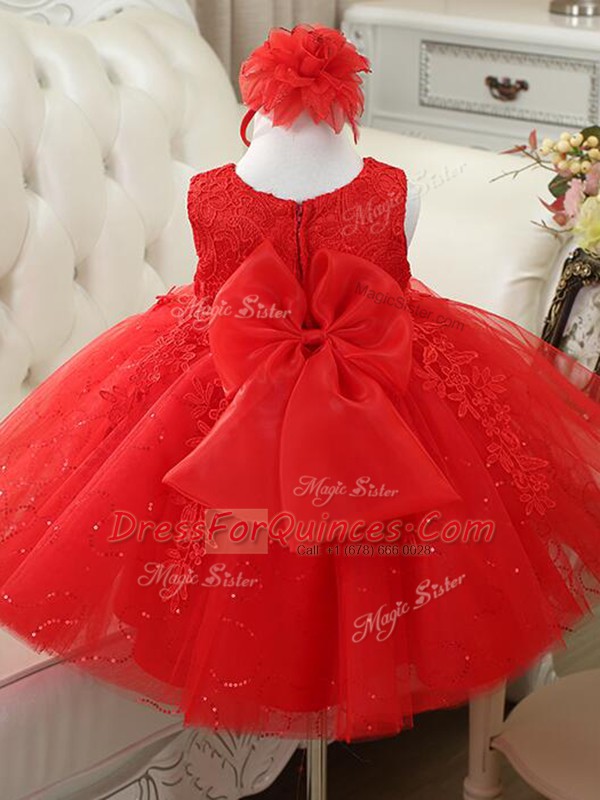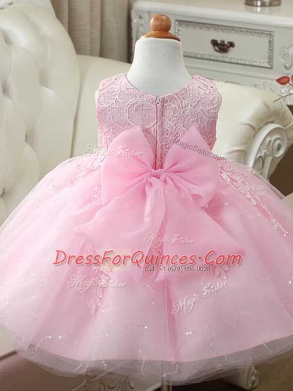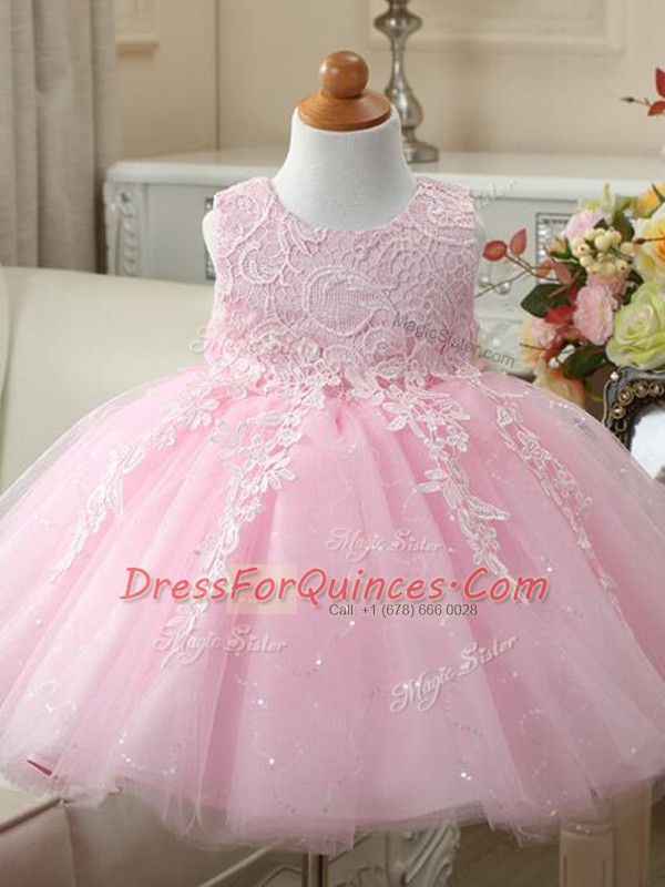 Knee Length Baby Pink Flower Girl Dresses Tulle Sleeveless Appliques and Bowknot