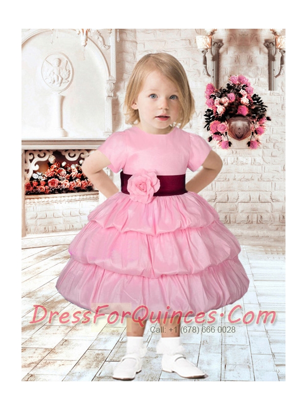 Lovely Pink Short Sleeves Tea-length Flower Girl Dress with Pick-ups