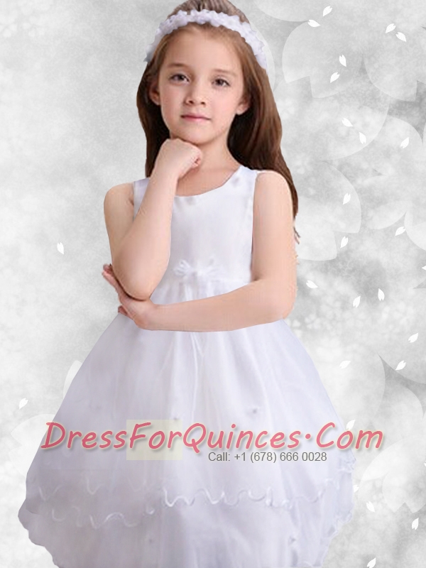 Popular Scoop A-Line Knee-length 2014 Flower Girl Dress with Appliques and Ruffles