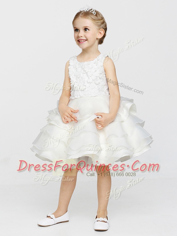 Scoop Clasp Handle White Sleeveless Appliques and Ruffles Knee Length Flower Girl Dresses for Less