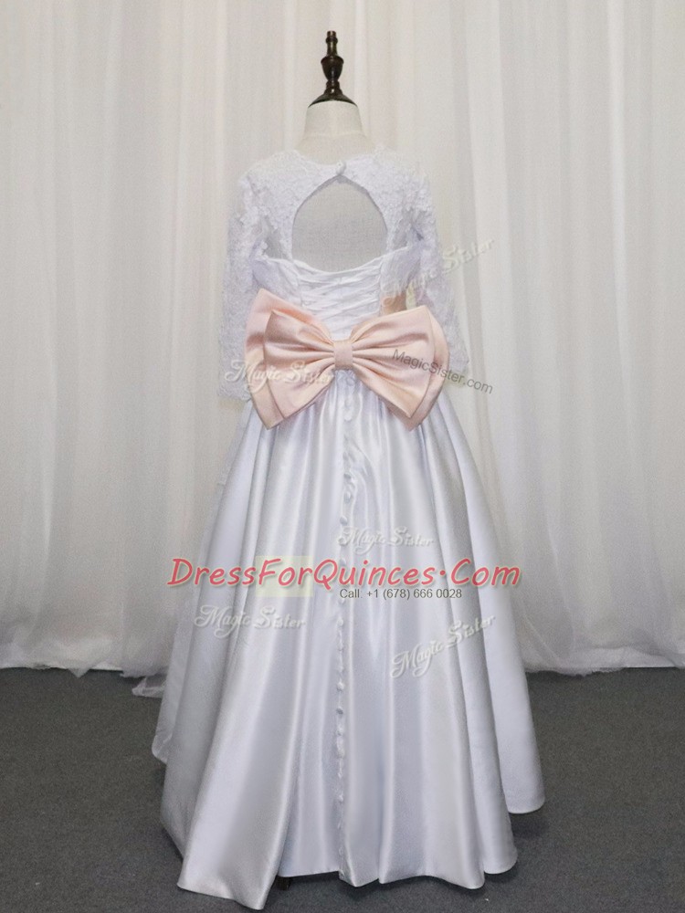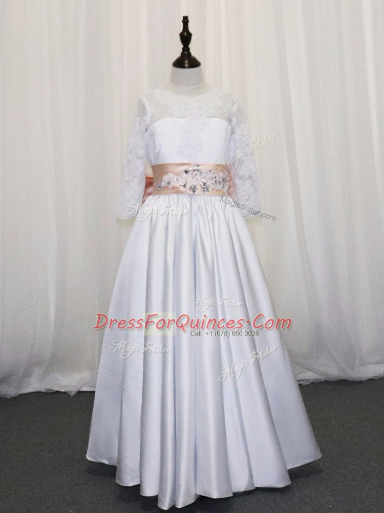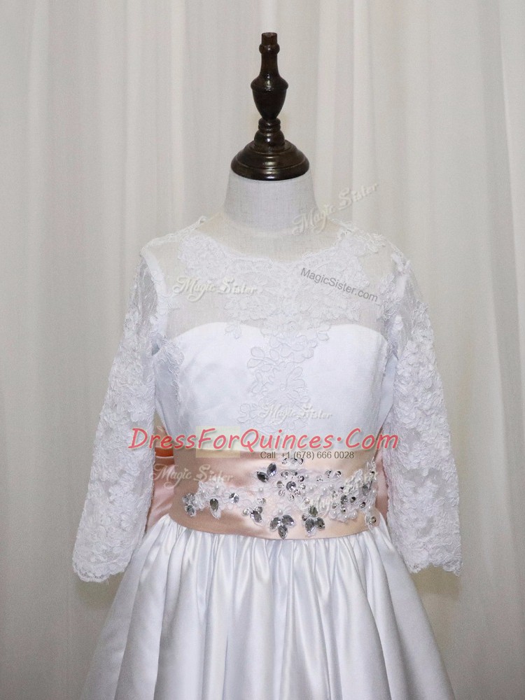 Scoop Half Sleeves Lace Up Flower Girl Dress White Satin