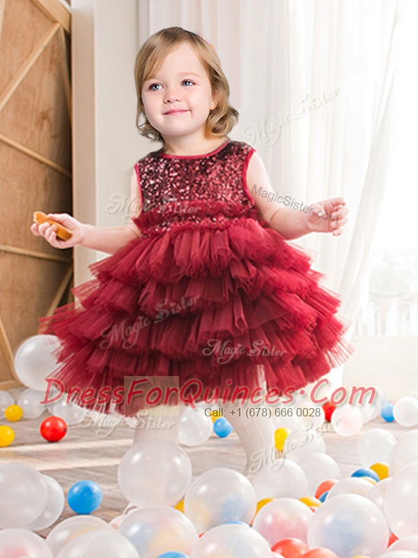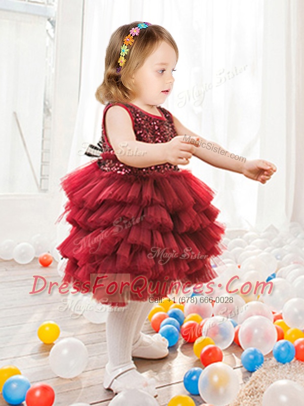 Scoop Mini Length Wine Red Flower Girl Dresses Tulle Sleeveless Ruffled Layers and Sequins