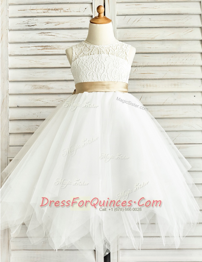 Scoop Ruffled White Sleeveless Tulle Zipper Flower Girl Dresses for Party and Wedding Party