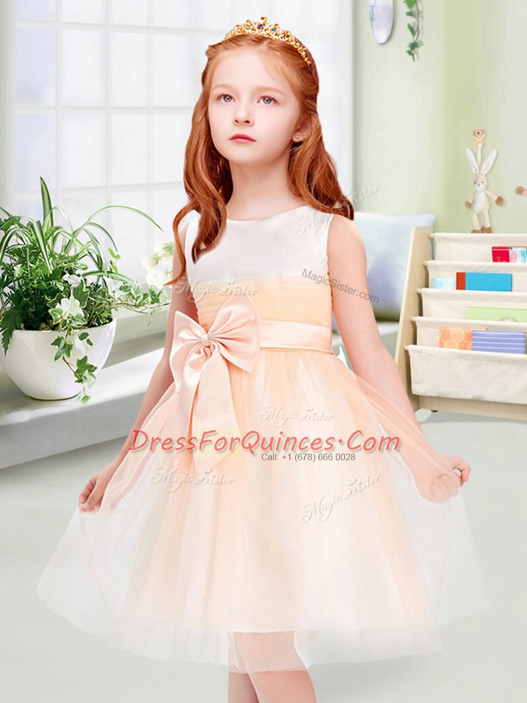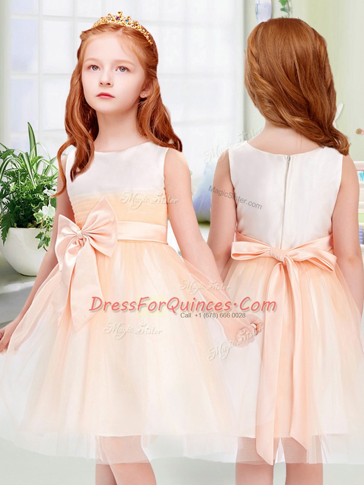 Sleeveless Tulle Knee Length Zipper Flower Girl Dress in Peach with Bowknot