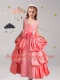 Straps Floor Length Watermelon Red Flower Girl Dress Taffeta and Lace Cap Sleeves Pick Ups and Bowknot and Hand Made Flower