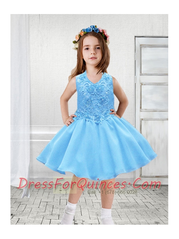 The Super Hot V-neck Knee-length Flower Girl Dress with Beading and Appliques