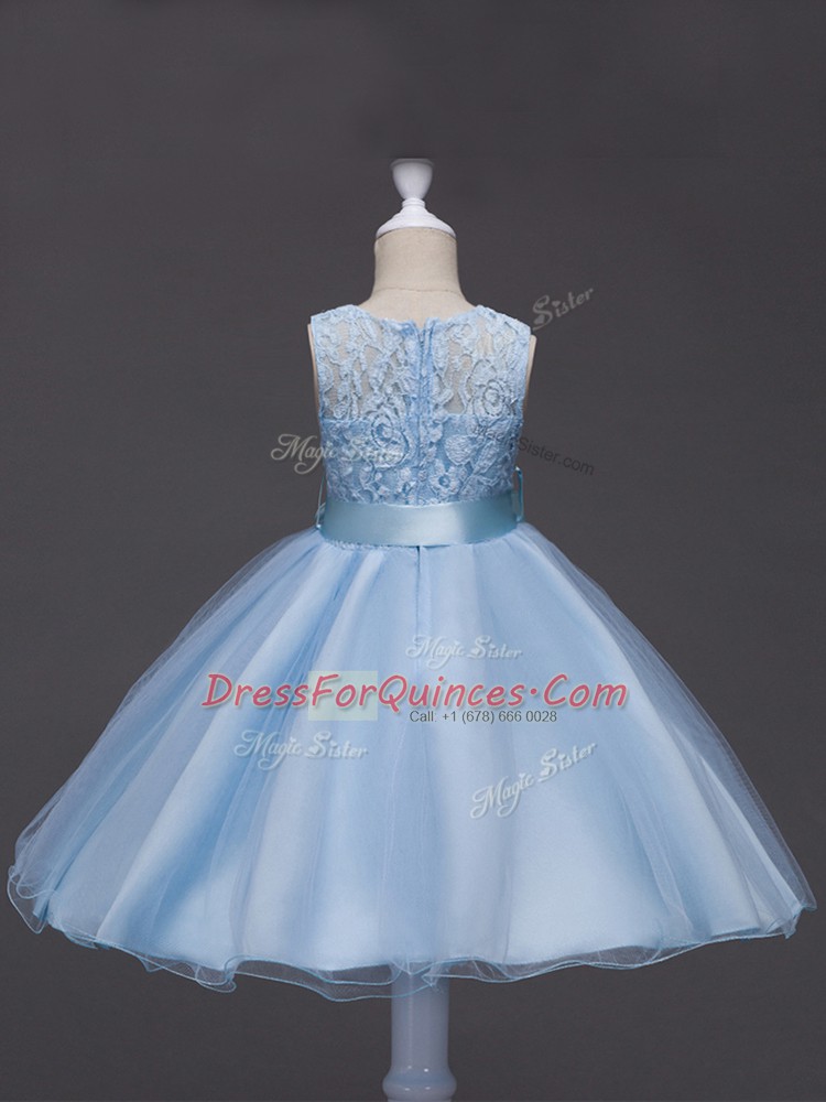 Tulle Scoop Sleeveless Zipper Lace and Belt Flower Girl Dresses for Less in Light Blue