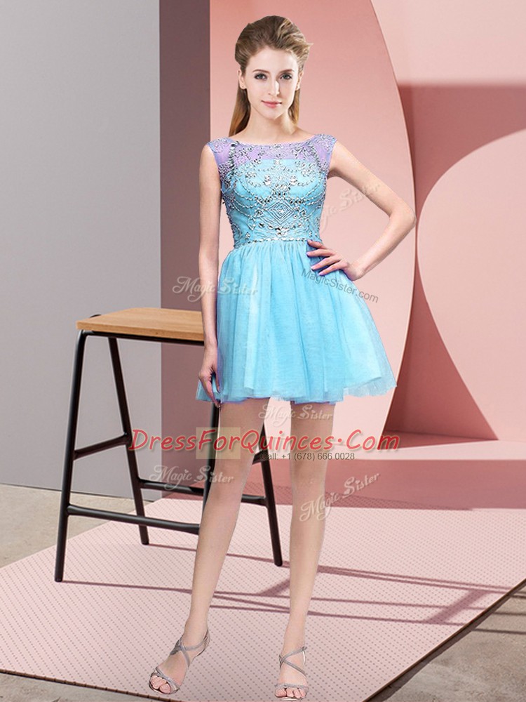 Baby Blue A-line Bateau Sleeveless Tulle Mini Length Zipper Beading Prom Party Dress