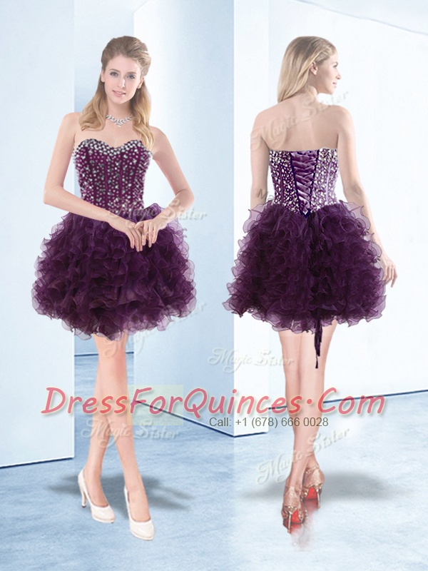 Beading and Ruffles Prom Evening Gown Dark Purple Lace Up Sleeveless Floor Length