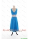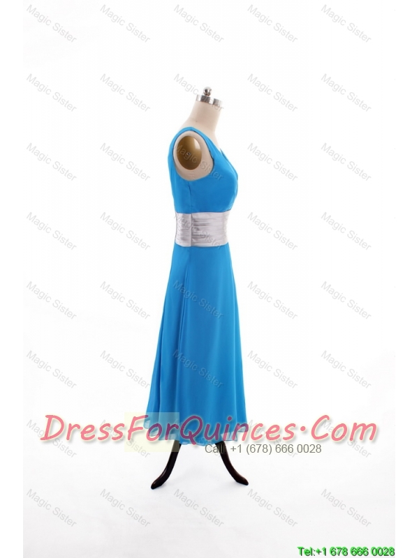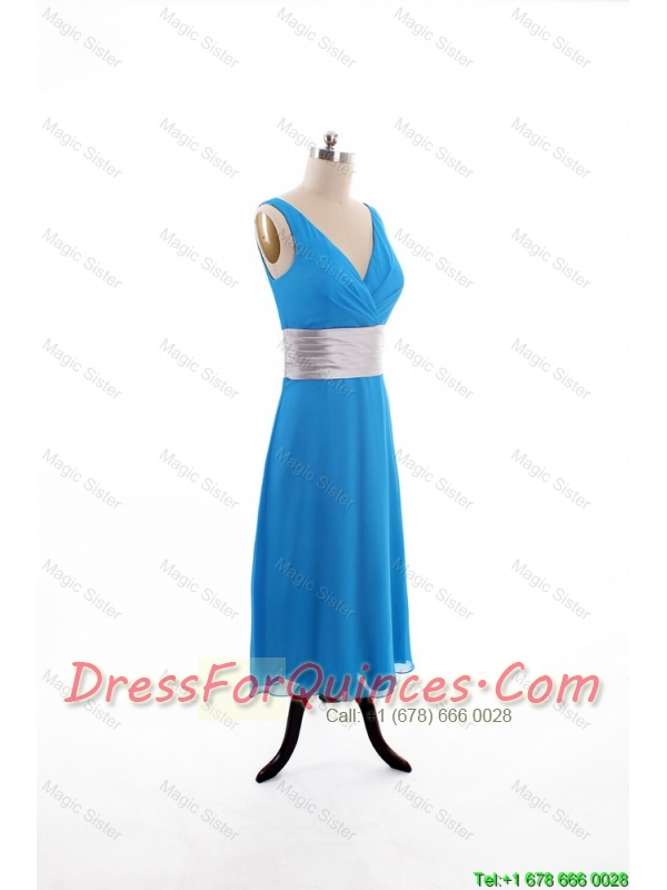 Cheap 2016 Spring Empire V Neck Tea Length Prom Dresses with Belt