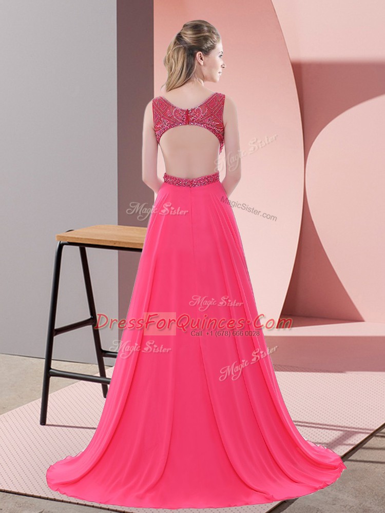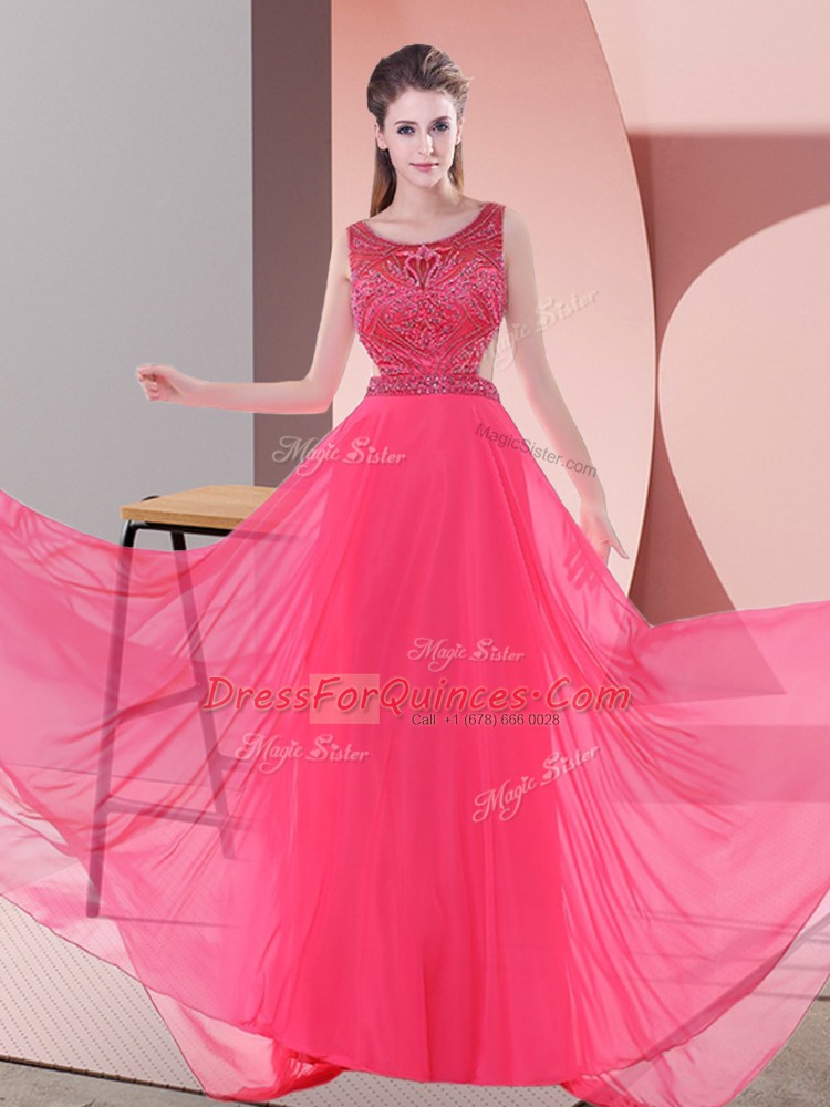 Coral Red Sleeveless Sweep Train Beading Prom Evening Gown