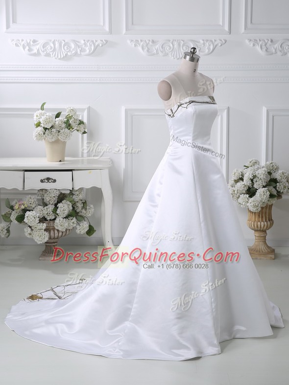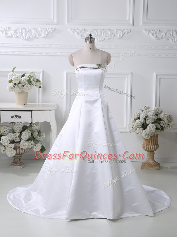 Custom Design White Lace Up Strapless Ruching Dress for Prom Satin Sleeveless Court Train