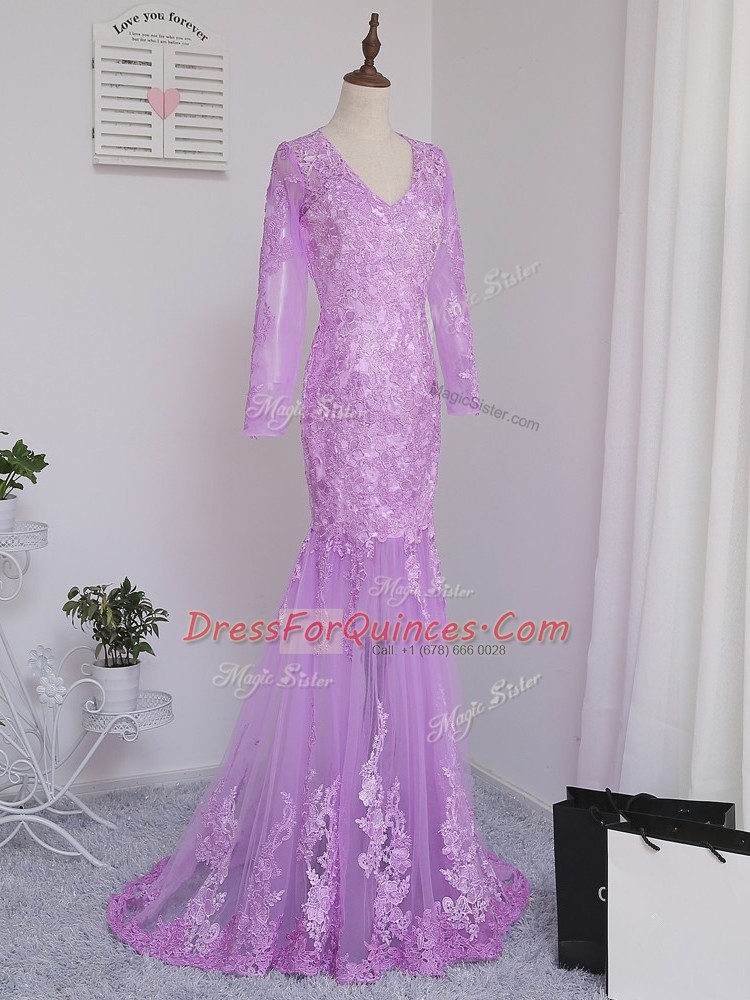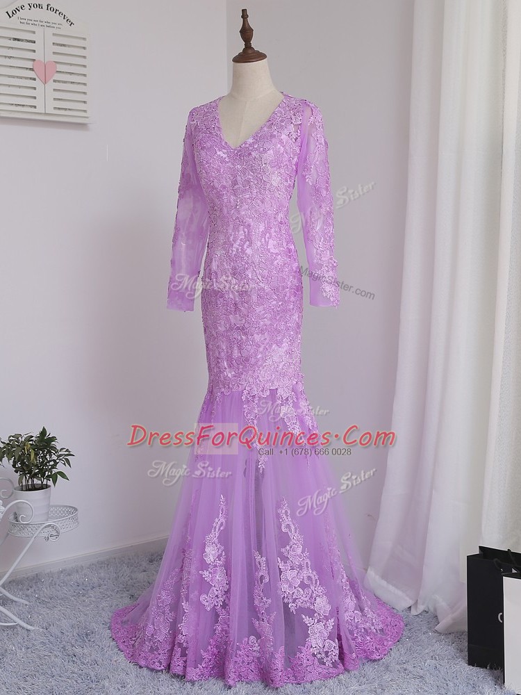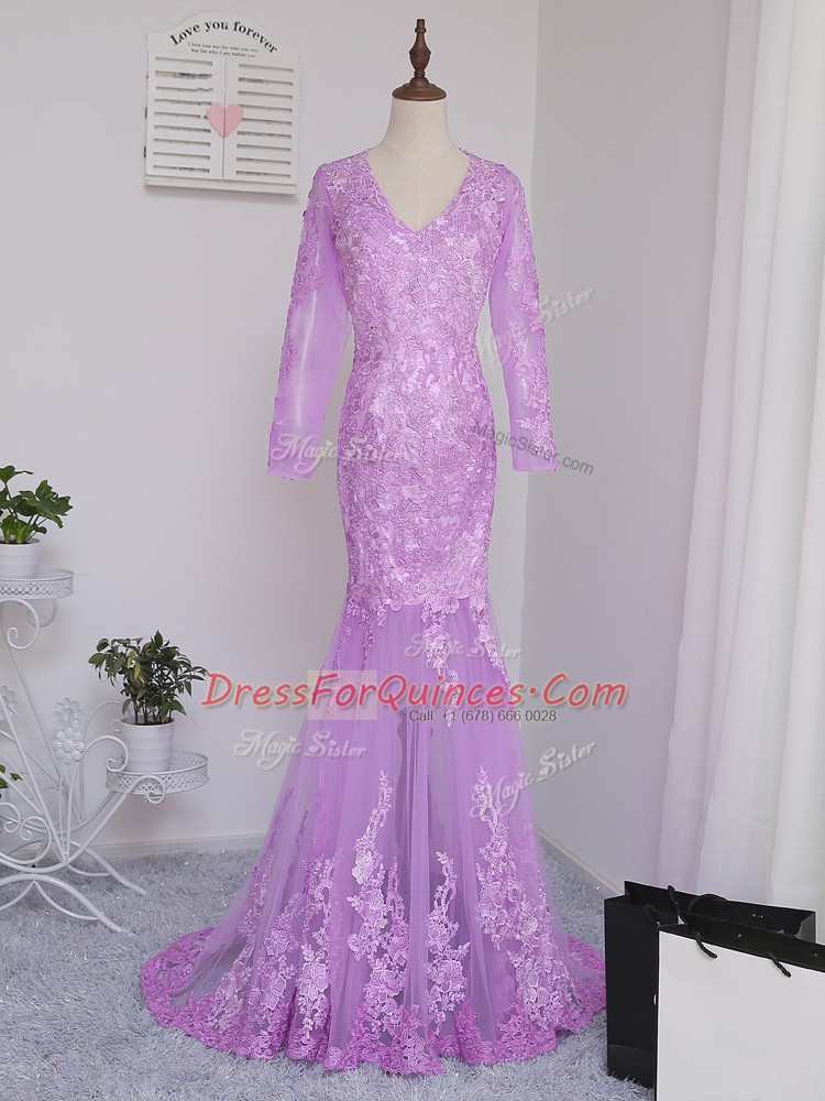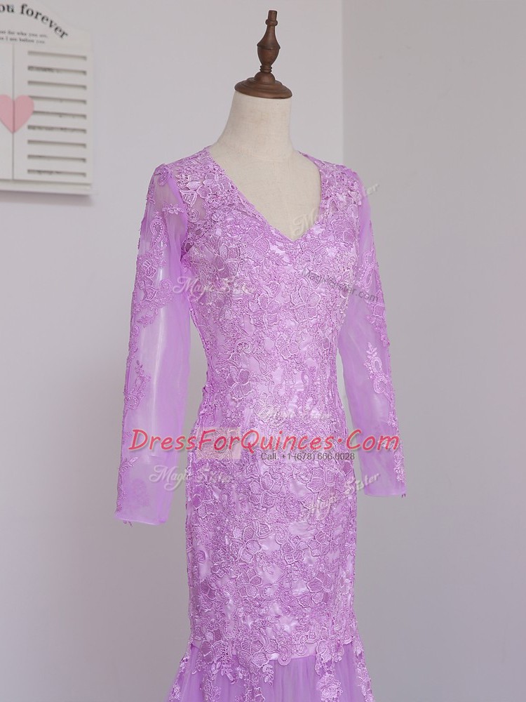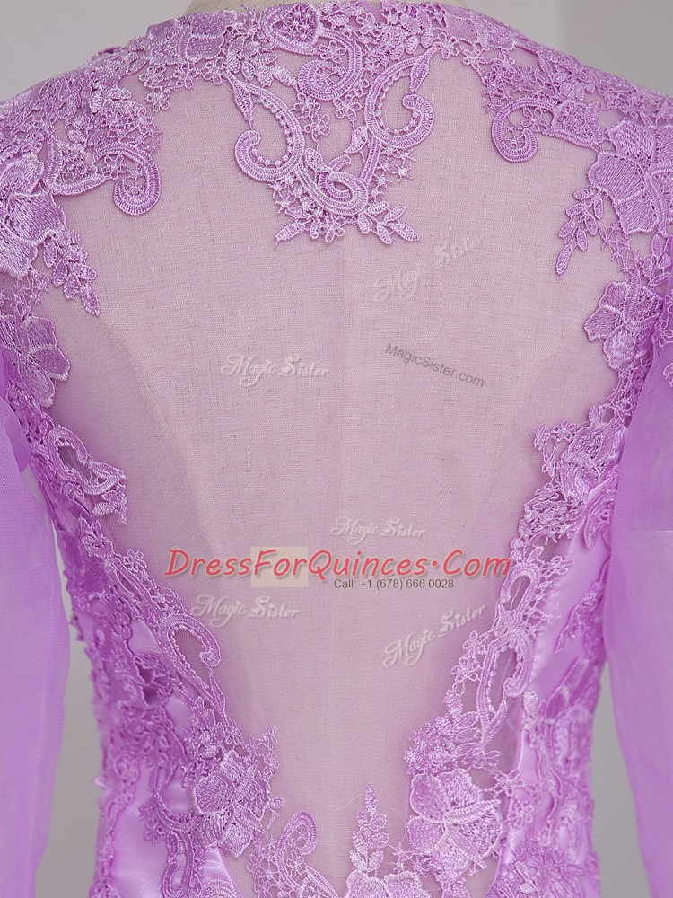 Edgy Lilac Long Sleeves Lace and Appliques Side Zipper Prom Gown