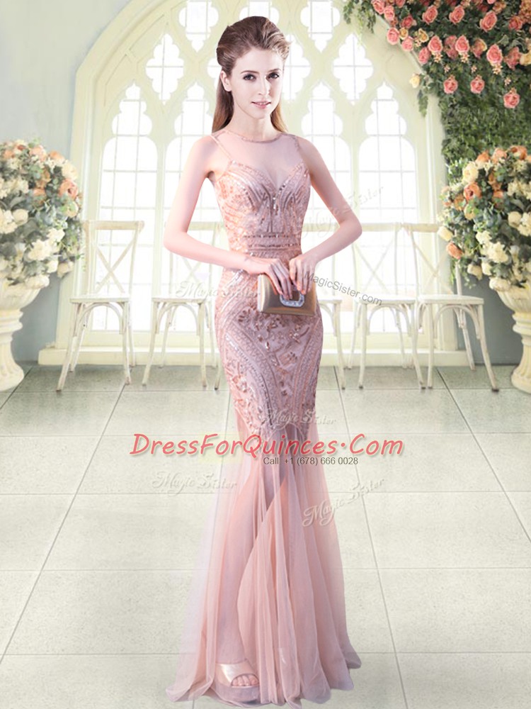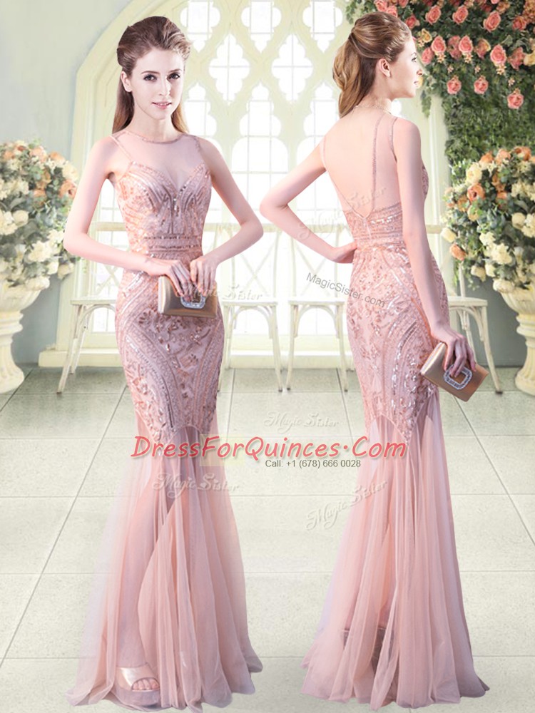 Fitting Pink Sleeveless Floor Length Sequins Backless Prom Dresses
