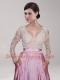 Flirting V-neck Long Sleeves Prom Evening Gown Floor Length Beading and Belt Pink And White Taffeta