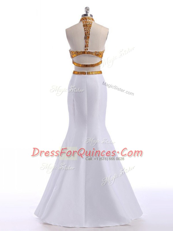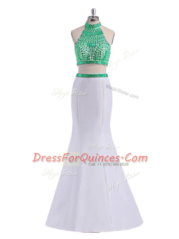 Halter Top Sleeveless Satin Evening Dress Beading Criss Cross