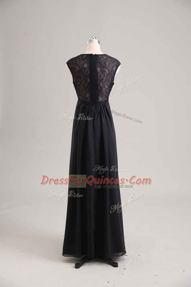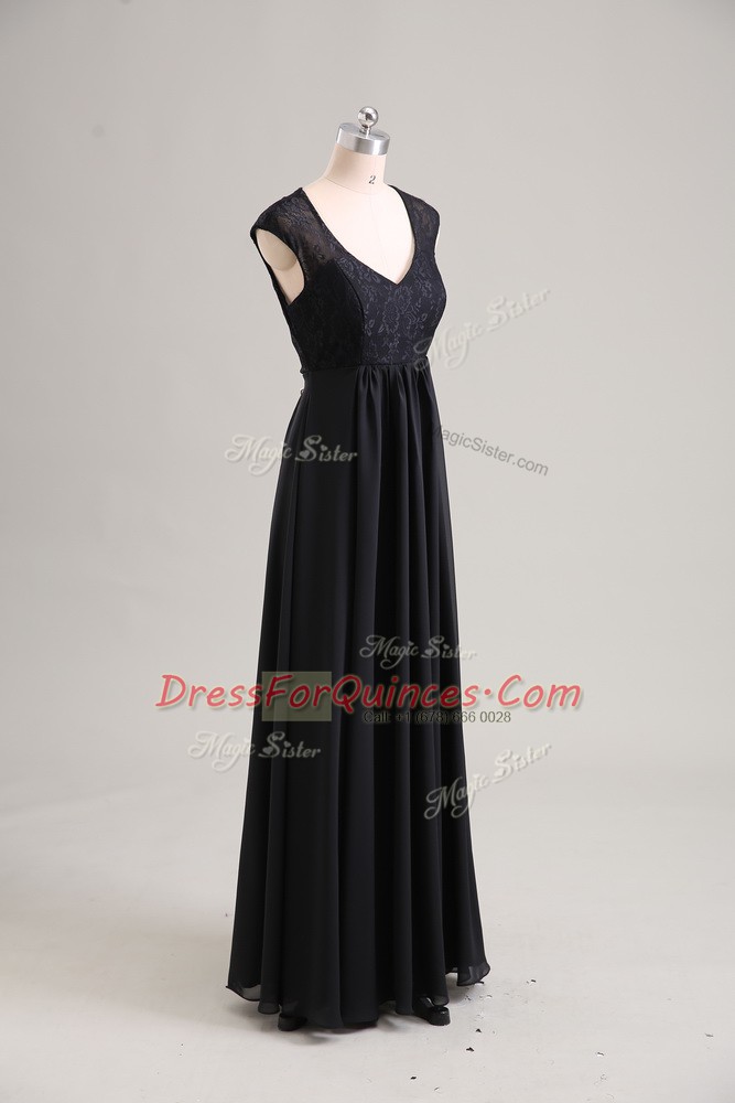 Lace Prom Party Dress Black Zipper Cap Sleeves Floor Length