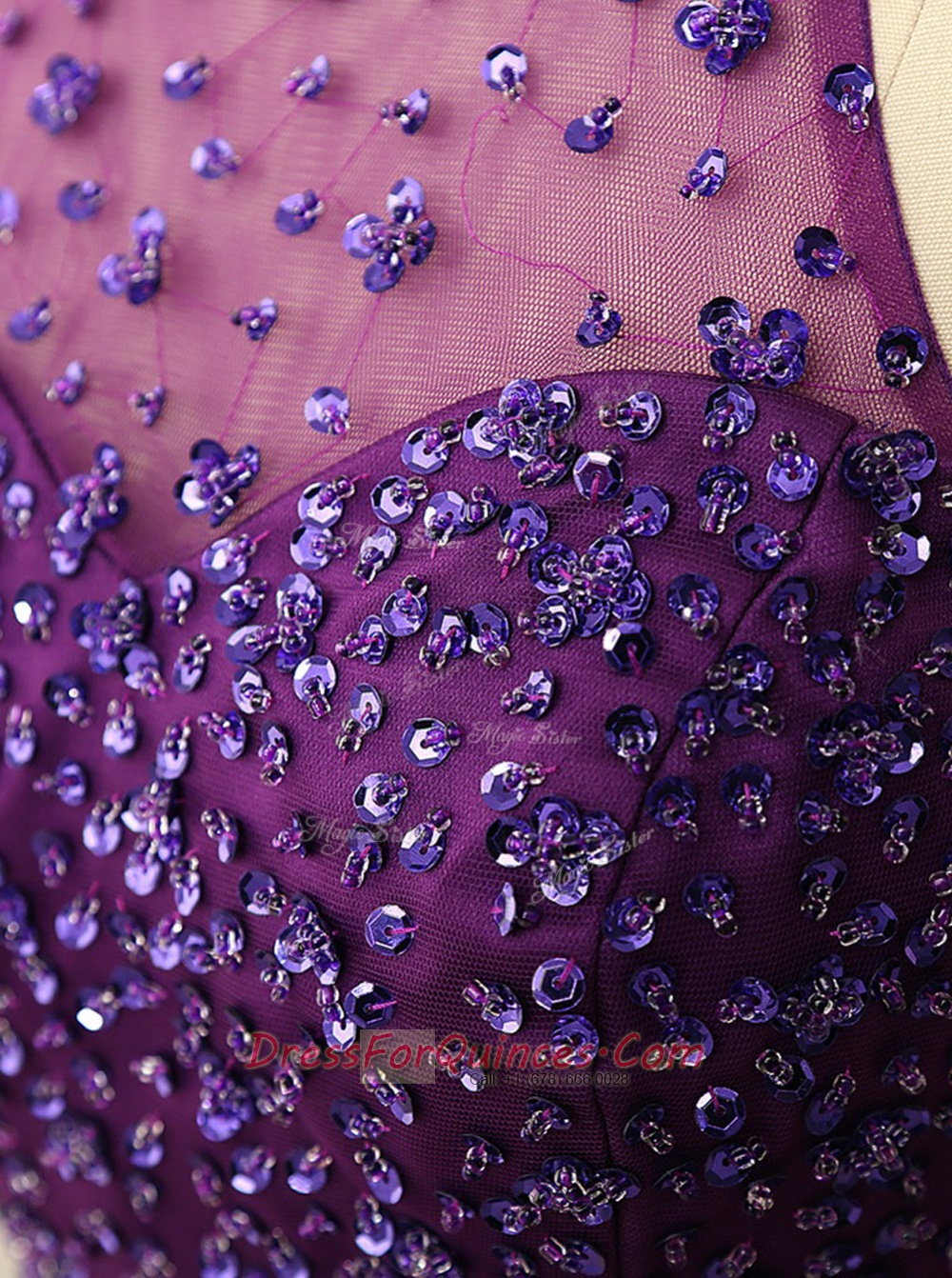 Purple A-line Tulle Halter Top Sleeveless Beading and Sequins Mini Length Zipper
