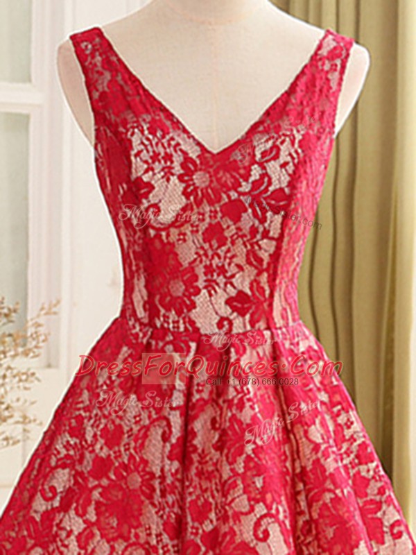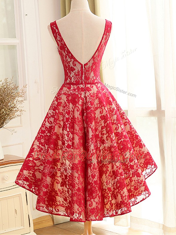 Red A-line Lace and Appliques Prom Dresses Backless Lace Sleeveless High Low