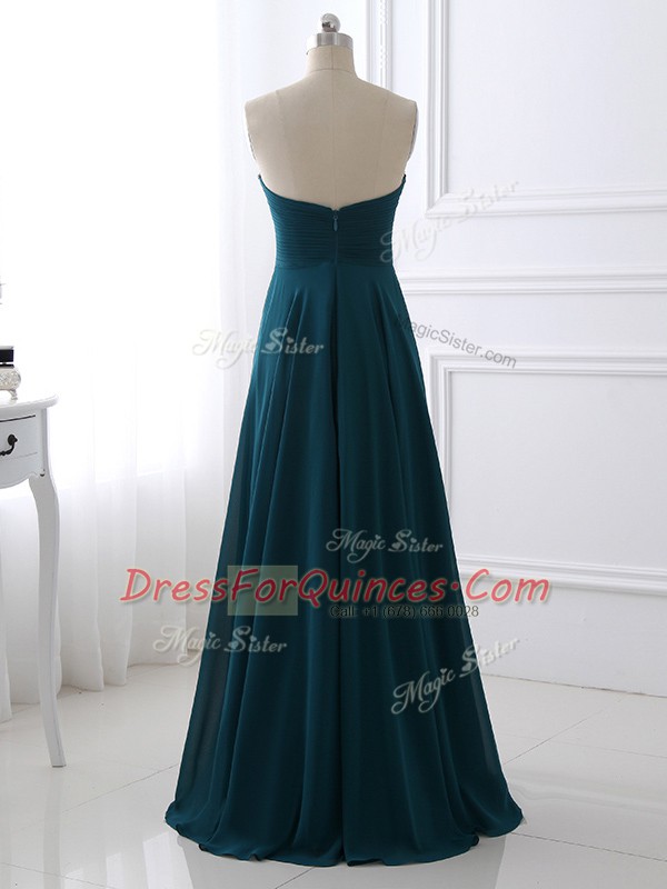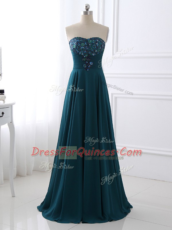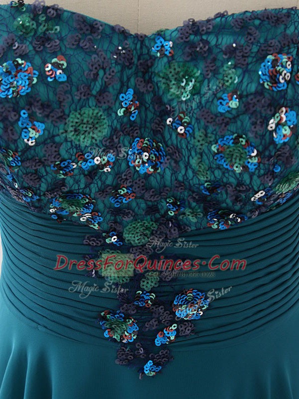 Top Selling Floor Length Teal Prom Evening Gown Chiffon Sleeveless Sequins and Ruching