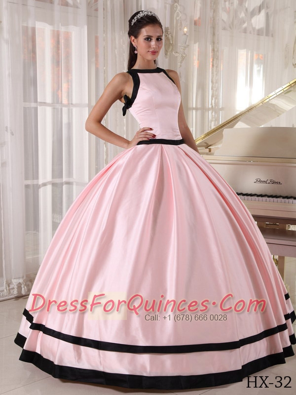 2014 Pink and Black Ball Gown Satin Bateau Floor-length Cheap Quinceanera Dresses