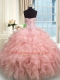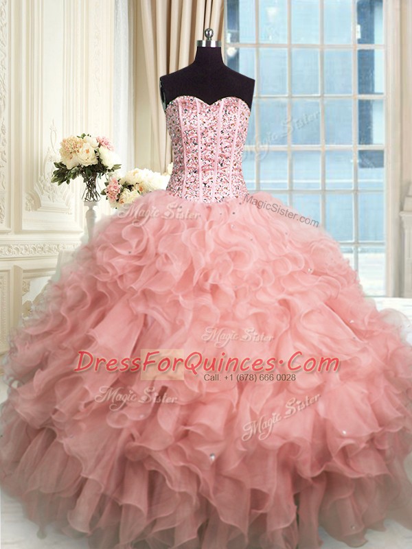 Adorable Rose Pink Ball Gowns Organza Sweetheart Sleeveless Beading and Ruffles Floor Length Lace Up Vestidos de Quinceanera