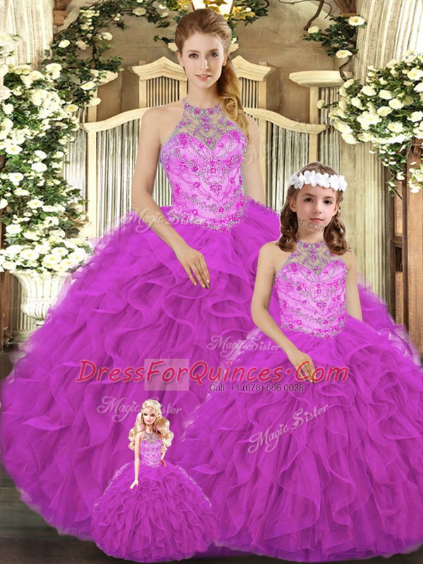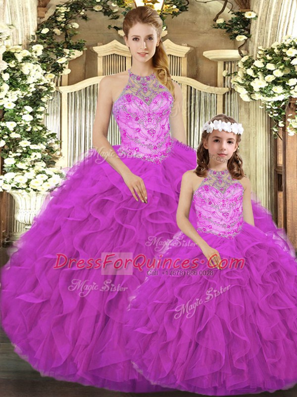 Best Selling Ball Gowns Sweet 16 Dresses Fuchsia Halter Top Tulle Sleeveless Floor Length Lace Up