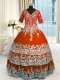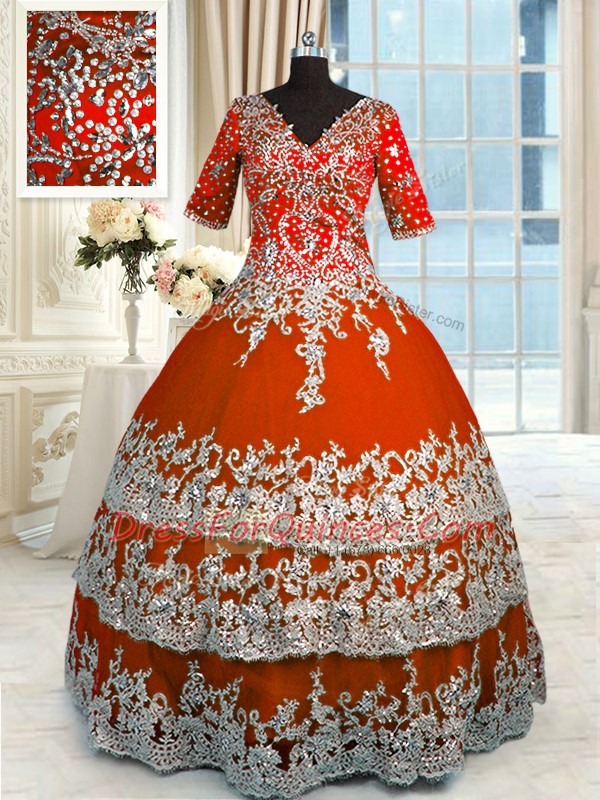 Best Selling Floor Length Orange Red Vestidos de Quinceanera Tulle Half Sleeves Beading and Appliques and Ruffles