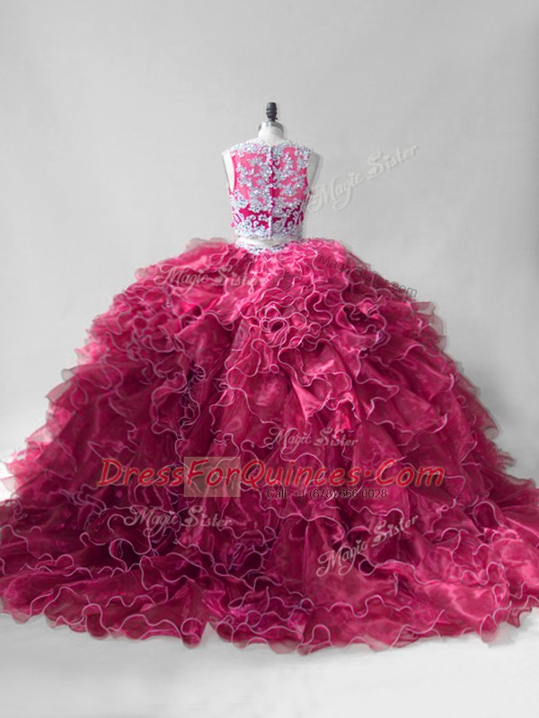 Classical Brush Train Two Pieces Sweet 16 Dress Hot Pink Scoop Organza Sleeveless Zipper