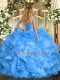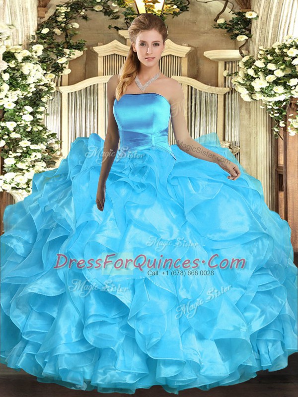 Custom Designed Strapless Sleeveless Vestidos de Quinceanera Floor Length Ruffles Aqua Blue Organza