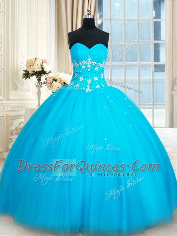 Cute Baby Blue Lace Up Sweetheart Beading Quinceanera Gowns Tulle Sleeveless
