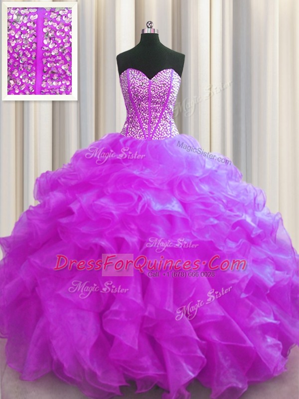 Designer Visible Boning Fuchsia Ball Gowns Beading and Ruffles Ball Gown Prom Dress Lace Up Organza Sleeveless Floor Length