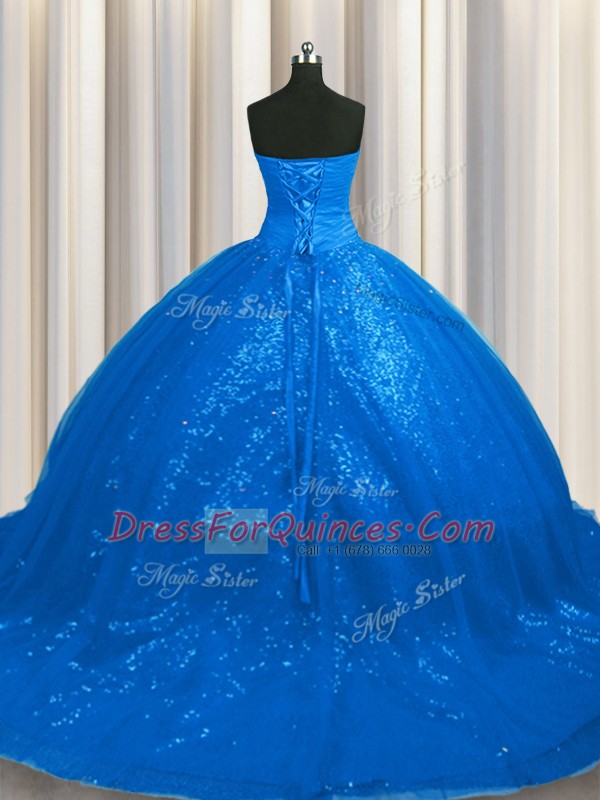 Elegant Sweetheart Sleeveless Tulle and Sequined Vestidos de Quinceanera Beading and Appliques Court Train Lace Up