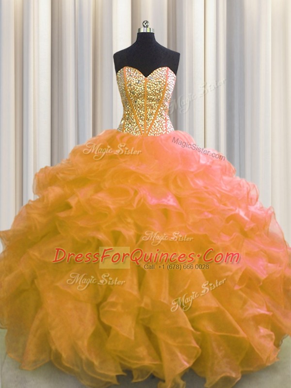 Exceptional Visible Boning Orange Ball Gowns Beading and Ruffles Vestidos de Quinceanera Lace Up Organza Sleeveless Floor Length