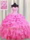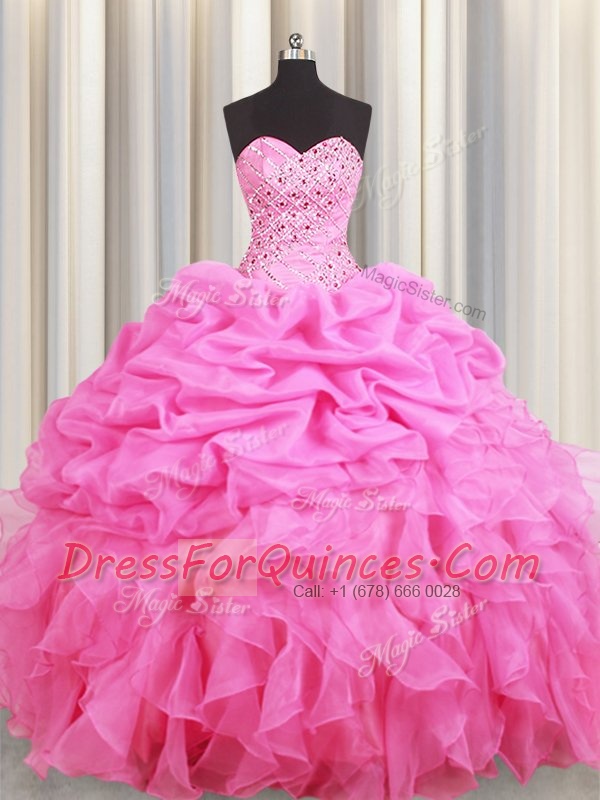 Eye-catching Rose Pink Lace Up Quince Ball Gowns Beading and Ruffles and Pick Ups Sleeveless Floor Length