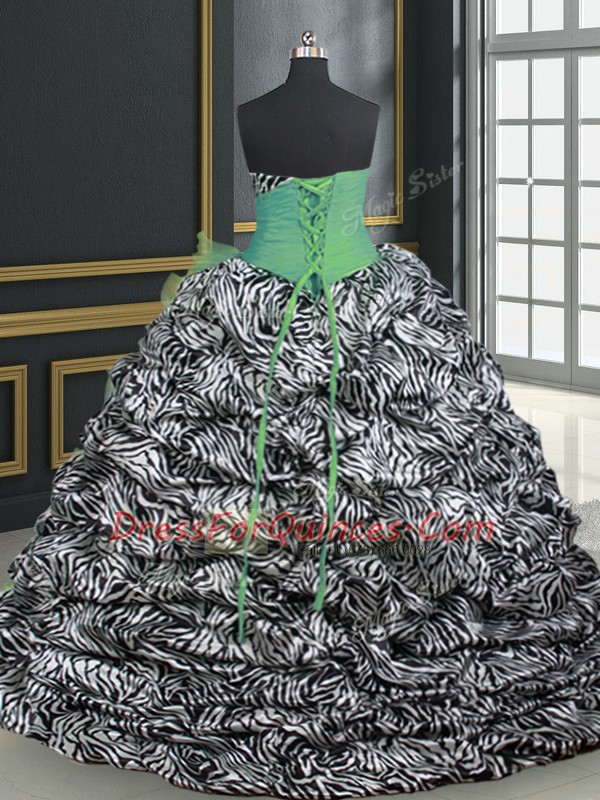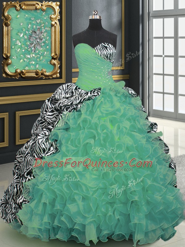 Fabulous Printed Beading and Ruffles and Pattern Sweet 16 Dresses Green Lace Up Sleeveless With Brush Train