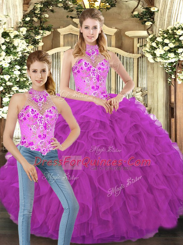 Fine Fuchsia Sleeveless Floor Length Embroidery and Ruffles Lace Up Vestidos de Quinceanera