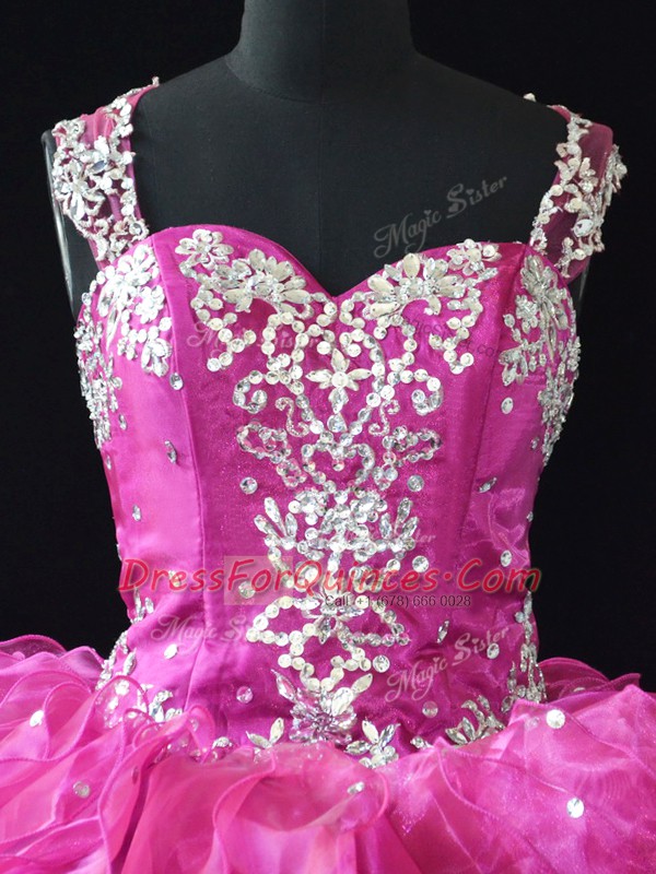 Fuchsia Organza Lace Up Quinceanera Dresses Sleeveless Floor Length Beading and Ruffles