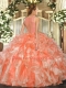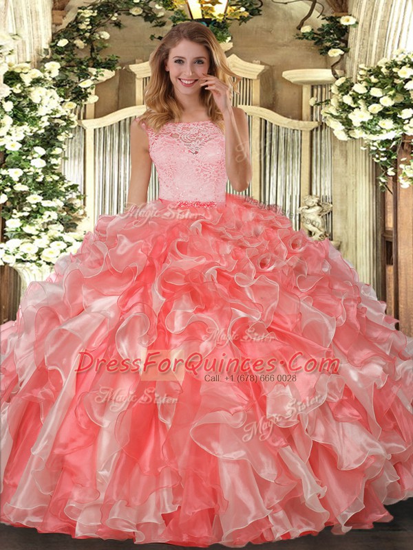 Glittering Floor Length Ball Gowns Sleeveless Coral Red Quince Ball Gowns Clasp Handle